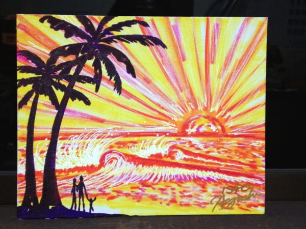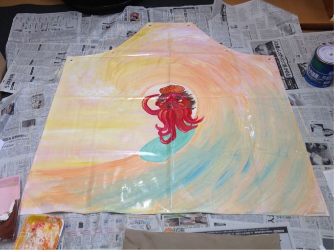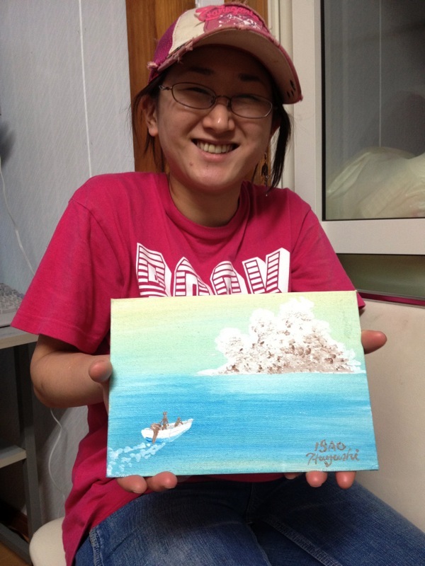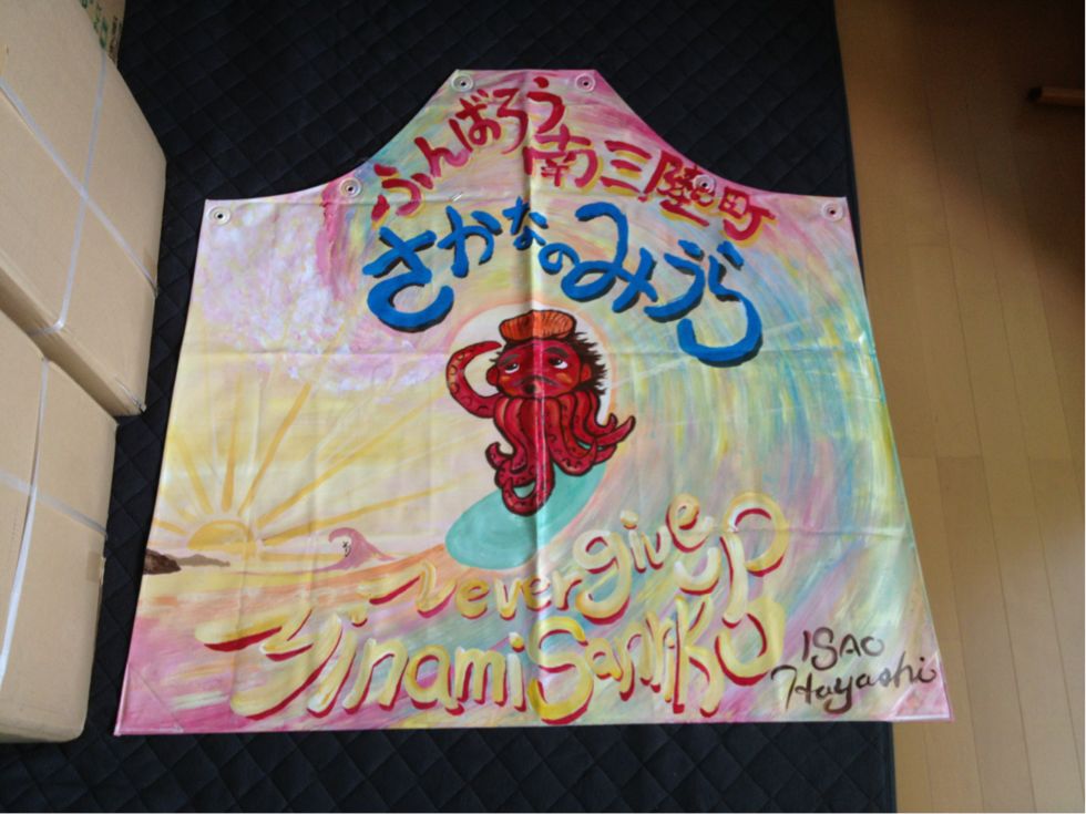 震災直後からボランティアとして広島から三陸へ赴き、一年間をさかなのみうらでで働いてきたユウコリンがこの日で退職して彼の待つ長崎へ行くとの事で被災者のスタッフ方から沢山働いてくれたので是非描いてあげて欲しい!!とのリクエストで夏の海に船出する絵を描かせてもらいました。