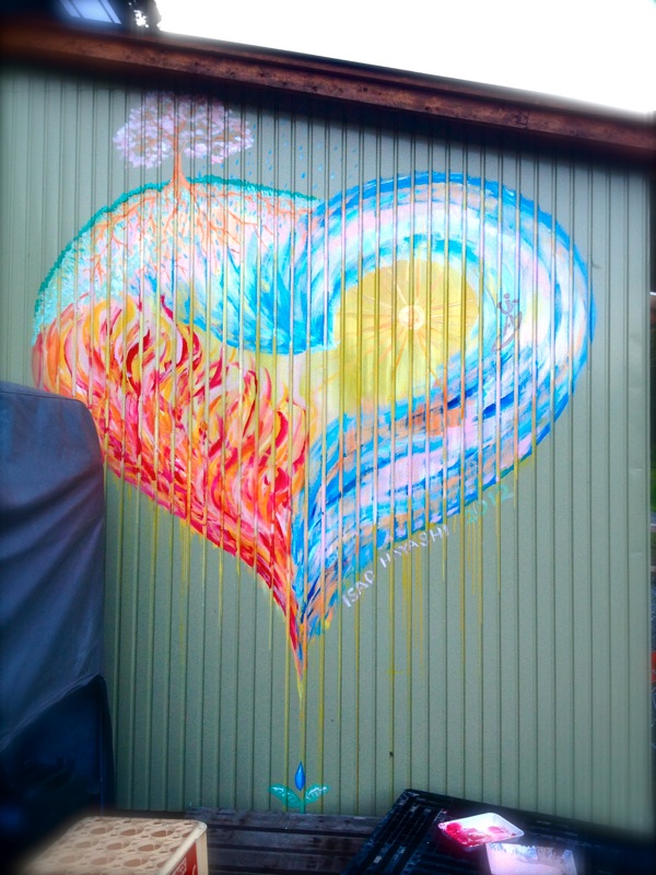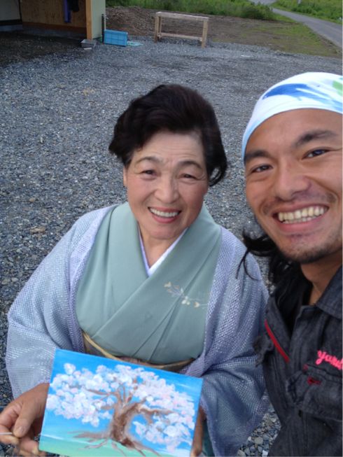 屋外制作中に話しかけてくれたカツコさん、親戚やご近所、ご友人や知り合いなど沢山が流されて暗い気分の日々を過ごしていたそうですが、「最近になってようやく外に出かけれるようになりました。今日は知人の結婚式で出かけたら壁の絵と貴方に出会って明るい気持ちになり嬉しいです!」とお礼のお言葉を頂き、僕もとても嬉しいです!!桜が大好きだと言うのでお着物の色合いに合わせて桜を描かせてもらいました。またお会いする日を楽しみにしております(*^^*)