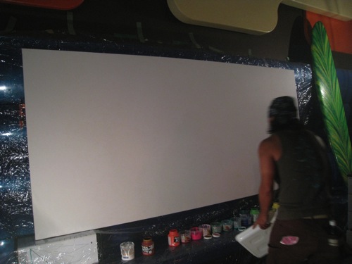 張ってしまえばデーンと大きなカンヴァスも当日の現場で数時間前に張るのは力仕事で実際本番が始まる前にカナリの体力を消耗してしまい腕はすでにパンパンになっていた。。