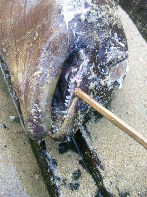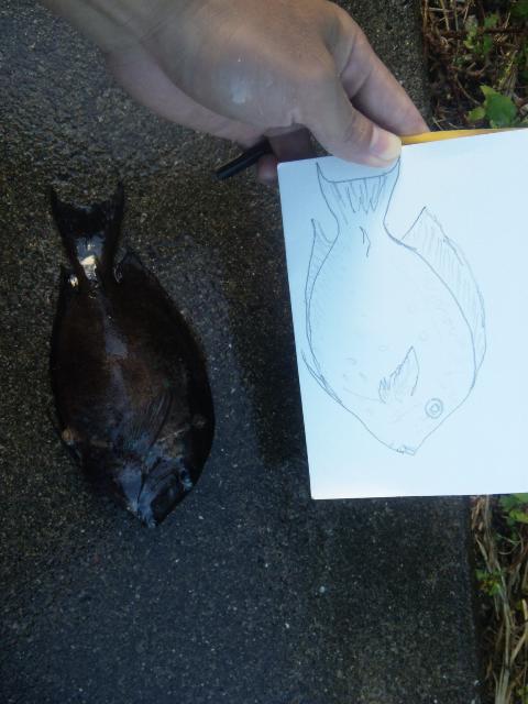 突いたからには持って帰りとりあえずスケッチして(夕方は寒くて簡単に描いたらコミック風になった)から内臓とウロコ取って塩焼きにして醤油つけてみたら白身魚で全然食べれた。