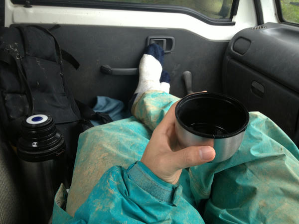 夫々が個々の車で休憩する。