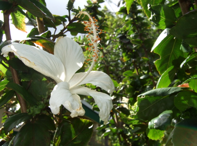 写真は裏庭に咲くハイビスカス。白は原種でピンクや黄色の色物は後から作られたらしい。具合が悪く寝ている間に「このプラントは病気にかかっている」と太い幹を残してすべて切り落とされてしまっていた。